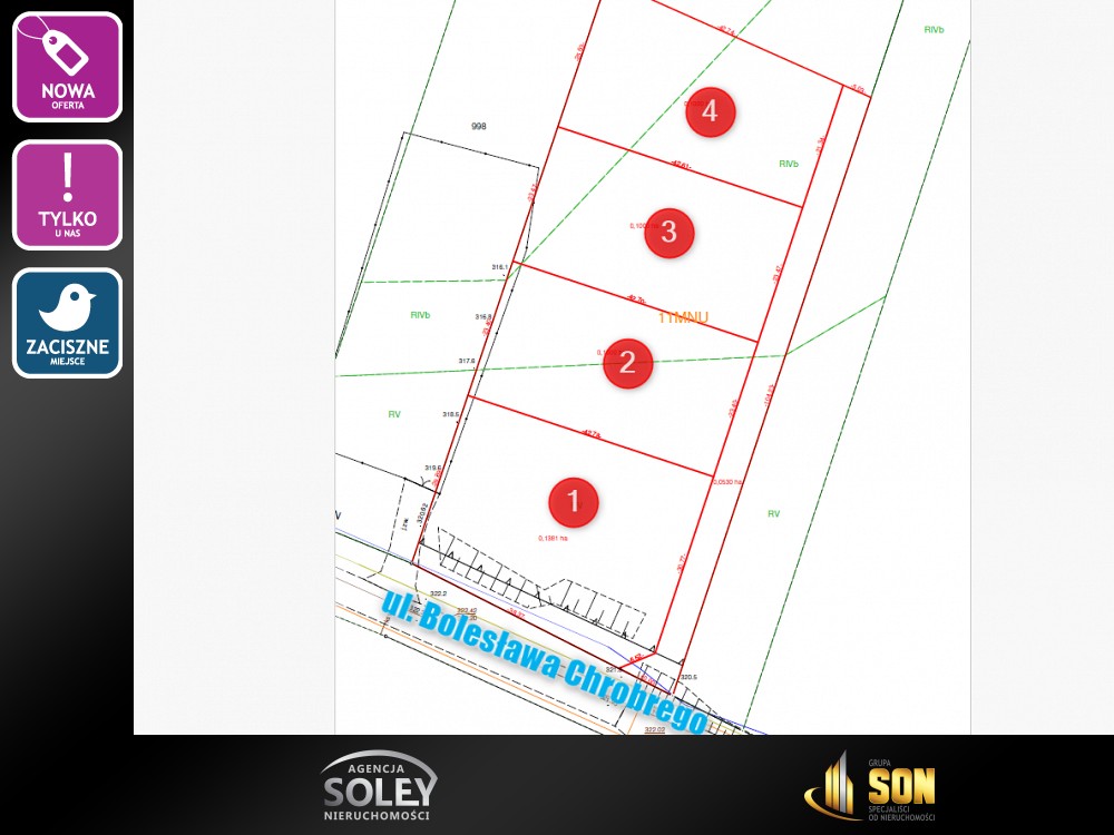 Powierzchnie pozostałych dzielonych geodezyjnie działek: ok.1381 m2, ok.1000m2, ok.1000m2,